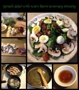 Anyways tonight I made spinach salads for dinner at work, complete with homemade warm bacon rosemary dressing. I am not going to lie to any of you and say this salad is healthy! It isn’t! The main ingredient is bacon (fat)! Proceed with cation! While it may be high on the fat scale it is even higher on the delicious scale! It is a super quick meal to throw together and yet impressive enough to serve at a dinner party. It can be served with chicken breast as a meal or as a simple side salad.