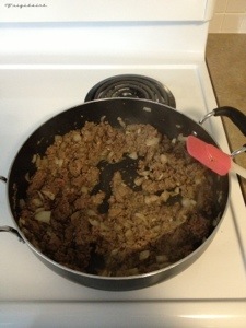 In a large skillet Sauté onions and garlic in olive oil over medium heat until fragrant, about 2 minutes. Add in ground beef and cook until throughly browned.