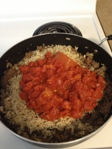 Once the beef is well browned add in tomatoes, soup, rice, spices and cook for 2-3 minutes.