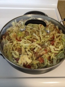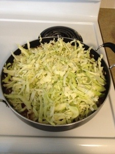 Add in the cabbage and water, stir to combine, cover and cook over medium heat for about 15 minutes until cabbage reaches desired consistency.