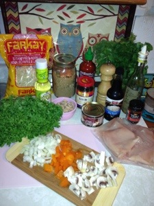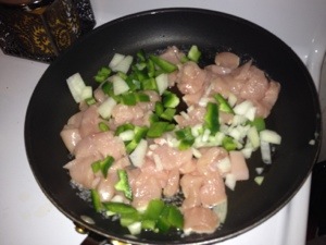 Once the chicken is almost cooked add in peppers, onions, mushrooms, water chestnuts, garlic, thai chili paste, and cook until soft.