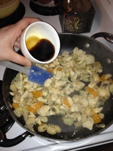 In a small bowl mix together soy sauce , brown sugar and vinegar. Add this mixture to pan and cook for 2 minutes.