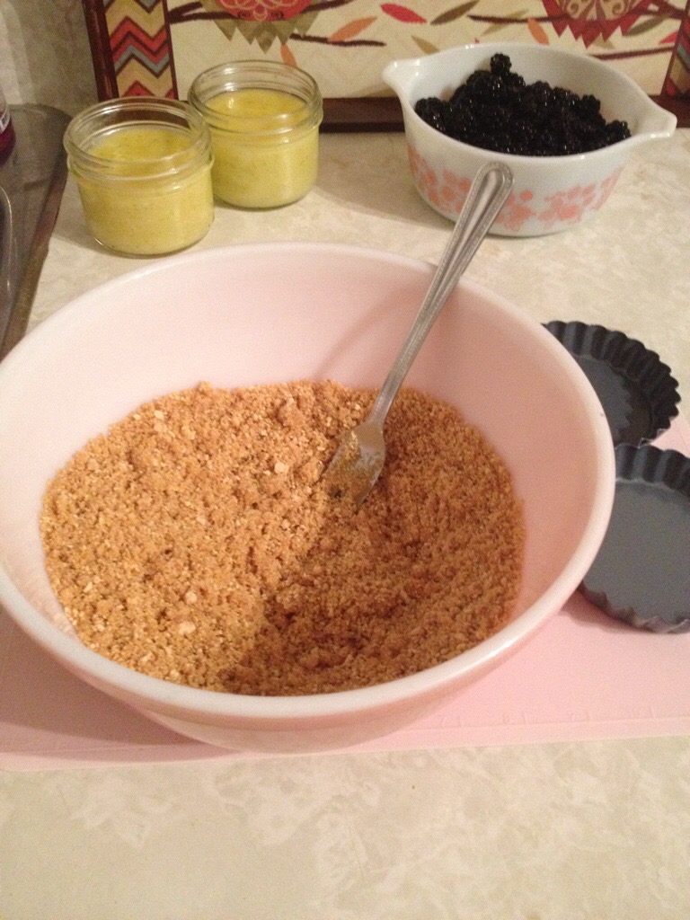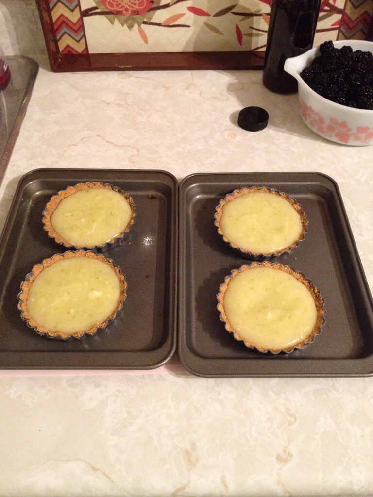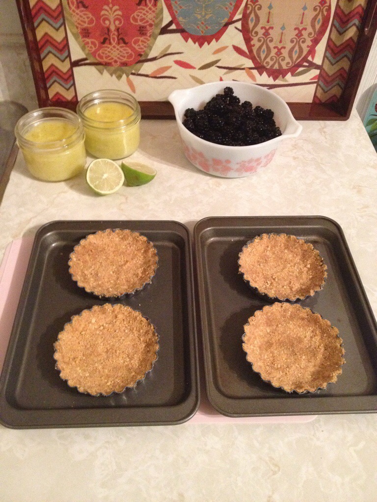 Once baked remove from oven and allow to cool. Fill with lime curd and top with as many blackberries as desired. Refrigerate for 3 hours until firm.