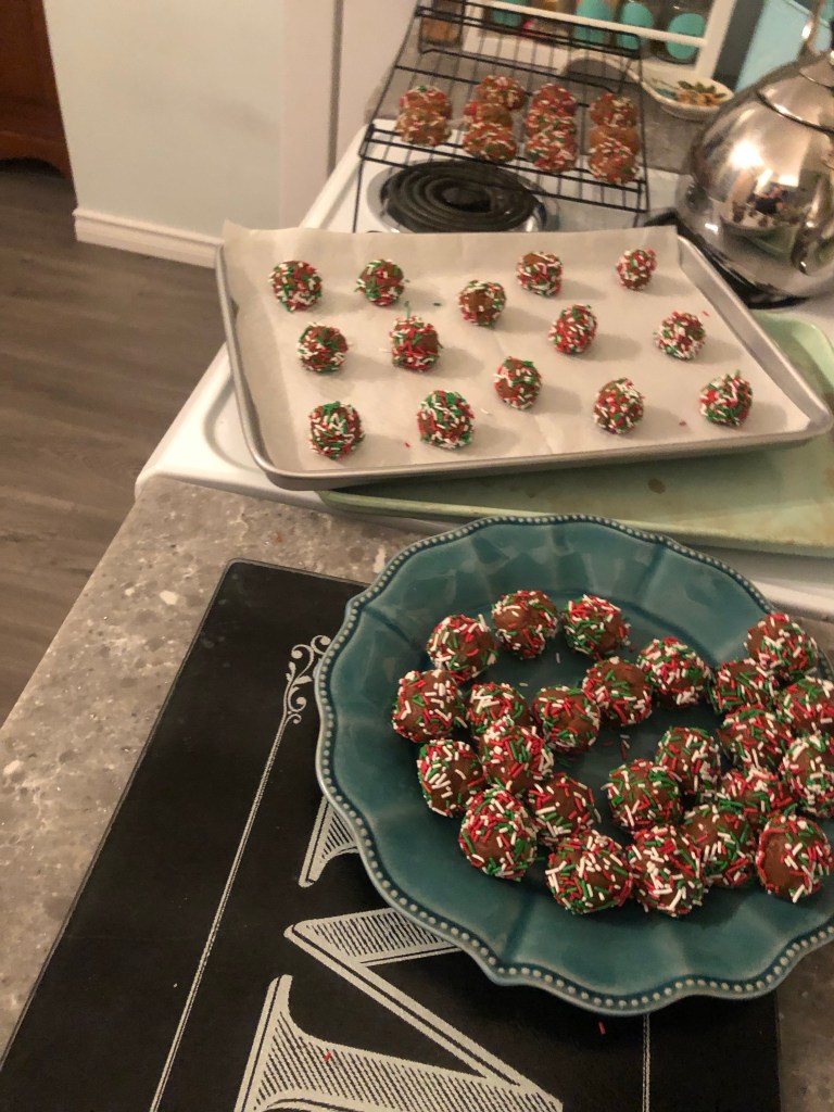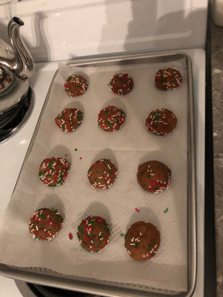 8. Roll the dough in the Christmas sprinkles and place on the prepared baking trays, at least 2” apart.