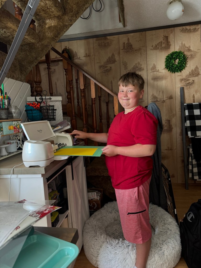 Today Jacob and I started working on this project at about 10 AM. The child had a crash course on how to use the cricut machine. He had a crash course on how to use Design Space software and how to use the MacBook. He pawed through the extensive box of scrapbooking paper to find just the right materials. He even ventured in to my sticker collection to see what he could find.