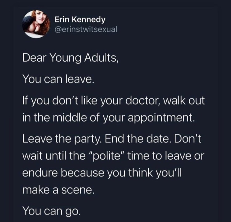 But I saw something today that really slapped me in the face and got my attention!! Now I’m sharing it with you because it’s so important and no one tells you this!!!! Don’t put your well-being at risk to avoid making a scene or hurting someone’s feelings!! This goes for all the things listed below but also for friendships, jobs, marriages, family dinners, appointments, etc!! If something is making you uncomfortable you don’t owe it to anybody to stay there and suffer!!!